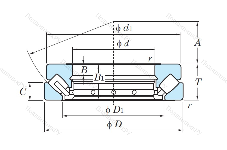 - Обладает более широкой зоной передачи усилий в сравнении с шарикоподшипниковыми аналогами, однако предназначен исключительно для работы с малыми скоростями вращения.
